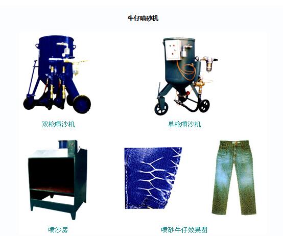 1.牛仔噴砂機是空壓機的壓縮空氣為動力,用噴槍將金剛砂直接噴射到牛仔褲上,使牛仔褲起到粗化、發(fā)白的效果。并可用模板制成顧 客需求的美麗圖案進行噴砂。完成一件牛仔褲僅需幾秒鐘時間。本機結(jié)構(gòu)合理,操作方便,成本低、產(chǎn)量大。廣泛適用于國內(nèi)各中小型服裝廠使用。